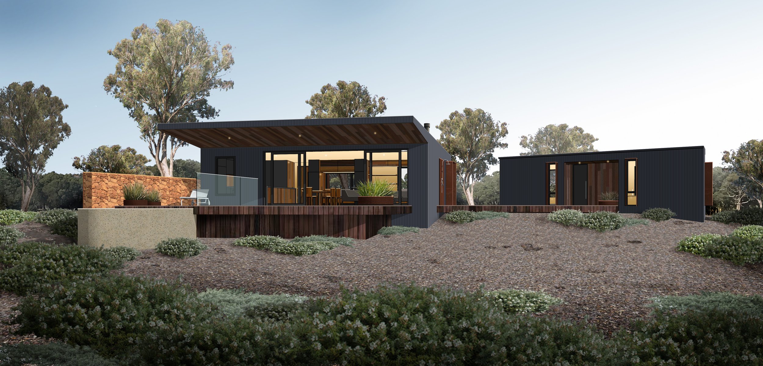 The simple shed-like metal-clad forms settle into the bush setting evoking a rural calmness and utility.